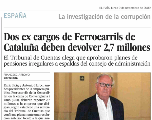 Hoy traemos a la bitácora la Sentencia del Tribunal de Cuentas de España, 13/2009, de 29 de junio pasado. Una extensa fundamentación que condenó a Enric Roig y Antonio Herce, ambos presidentes de la empresa pública Ferrocarrils de la Generalitat pues promovieron, a espaldas del consejo de administración, un plan de pensiones para ellos mismos y otros miembros del comité de dirección de la empresa por un importe de 2.631.843,75 euros.