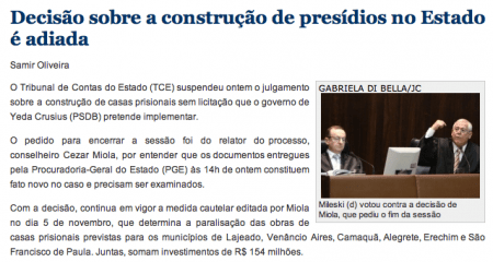 Por otra parte, mis queridos colegas del Tribunal de Cuentas del Estado de Rio Grande do Sul (capital Porto Alegre) estaban algo nerviosos. ¿La causa? La petición de dispensa del procedimiento licitatorio ordinario realizada por el Gobernador para construir o arreglar los 30 presidios gauchos que superan el quíntuplo de su capacidad. Un procedimiento negociado con publicidad de 100 millones de euros.