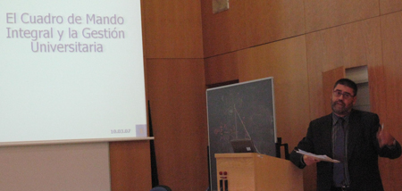Pues bien, fue interesante la exposición de los avances de la actualización del Documento nº 8 Cuadro de mando integral por Antonio López Hernández, catedrático de contabilidad de la Universidad de Granada, que veis en la foto concluyendo con dos ideas esenciales, no por reiteradas menos importantes:  el modelo debe elaborarse con el apoyo del equipo directivo de la institución y la estrategia debe ejecutarse de forma consensuada al máximo. Todo el personal debe implicarse en el proceso, con apoyo en abundante herramienta informática.