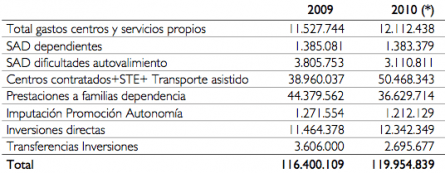 Así, de acuerdo con el cuadro siguiente, entre 2009 y 2010, el gasto directo en dependencia en la Comunidad Foral se ha incrementado en un 3,5 por ciento, alcanzando un importe de prácticamente 120 millones.