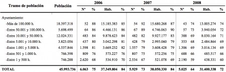 En el caso de los ayuntamientos, la rendición alcanza el 75%, 73% y 64% en cada uno de los ejercicios analizados, respectivamente, si bien estos porcentajes varían sustancialmente en atención al tramo de población de los municipios, presentando unos niveles de rendición menores los municipios de menor población, tal y como se observa en el cuadro y grafico siguientes (población a 1 de enero de 2008) que se puede pinchar para ampliar: