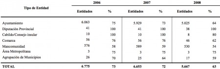 Durante los ejercicios 2006, 2007 y 2008 (ojo aquí falta País Vasco) el número de entidades que rindieron sus cuentas generales, sobre un total censo de 9.271, 9.282 y 8.989 entidades, respectivamente, por tipo de entidad, presentó el siguiente detalle (pinchar para ampliar):