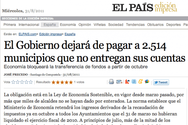 Parodiando la famosa obra de Schumacher (el economista, no el piloto) y en relación con las finanzas municipales, diríamos que los pequeños ayuntamientos españoles tienen un serio problema, no sólo de financiación: son remolones en la rendición de cuentas, como puede verse hoy en el artículo de El País. Tras la nueva Ley de Economía Sostenible, los alcaldes debían remitir la liquidación del presupuesto al Ministerio de Hacienda antes del 31 de julio pasado y un tercio –los pequeños municipios- aun no lo han hecho. La consecuencia es que no recibirán la transferencia del fondo de cooperación municipal. Al final, el problema se realimenta y la morosidad formal deviene en material …