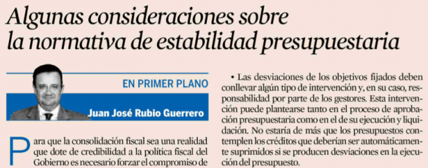El tema de hoy es planteado en un oportuno, sucinto y meditado artículo del diario Expansión titulado Algunas consideraciones sobre la normativa de estabilidad presupuestaria. Su autor, Juan José Rubio Guerrero, es Catedrático de Hacienda Pública de la UCLM y fue director entre 2000 y 2004 del Instituto de Estudios Fiscales. Plantea la necesidad de un seguimiento de la aplicación de la normativa que desarrolle el nuevo artículo 135 de la Constitución Española “bajo la órbita de un organismo u oficina independiente y neutral para controlar y supervisar el Presupuesto, como ocurre en otros países, que tendría competencias sobre el conjunto de las Administraciones Públicas”.