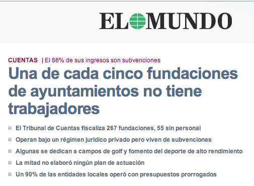 El pleno del Tribunal de Cuentas ha aprobado, el pasado 23 de febrero de 2012, el Informe de Fiscalización de las Fundaciones del Ámbito Local, referidas al ejercicio 2009. Se trataba de determinar y evaluar, en la medida de lo posible, los sistemas y procedimientos establecidos para efectuar el seguimiento, la gestión y el control de la actividad económico financiera, así como de verificar el cumplimiento de las disposiciones legales y reglamentarias aplicables a estas entidades, incluidas las normas reguladoras de su actividad económico financiera.