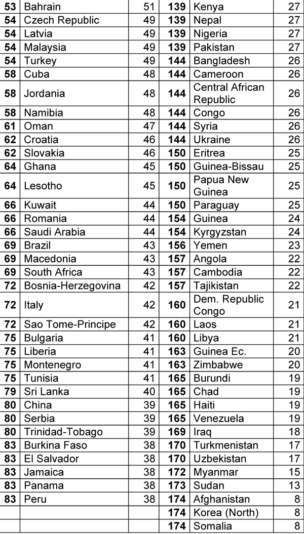 Este ranking seguramente será mejorable pero hay un consenso general de los expertos para defender sus resultados. La parte superior de esta lista de la incorruptibilidad la encabeza el virtuoso trio habitual: Dinamarca, Finlandia y Nueva Zelanda, todos con una puntuación igual de 90 sobre 100. En los últimos lugares, también el habitual trio calavera: Afganistán, Corea del Norte y Somalia, todos con una puntuación igual, de 8. Siempre nos queda la duda de cómo habrán conseguido «evaluar» desde dentro estos países sin opinión pública y donde la población civil es bastante inaccesible para un extranjero .