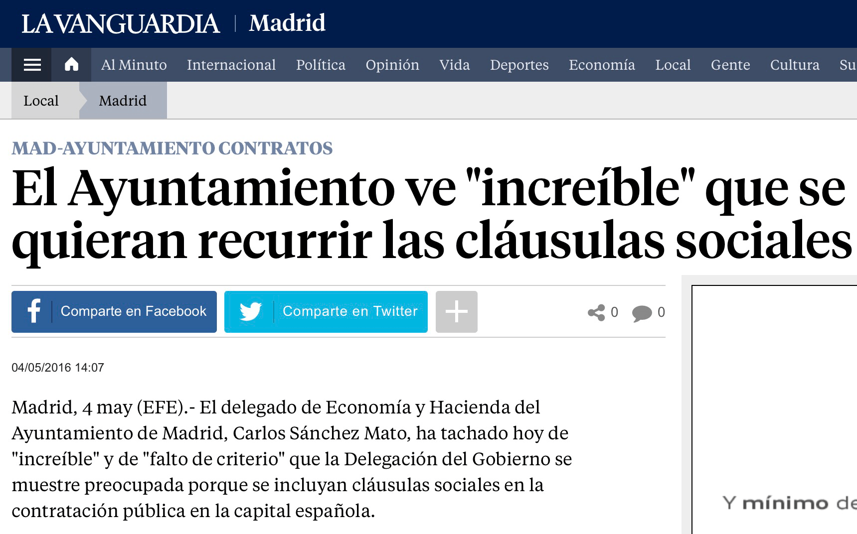 Como puede verse, avanzamos, con muchas dificultades hacia un contrato público con mayor sensibilidad social. El Ayuntamiento de Madrid ha aprobado recientemente un interesante Decreto Instrucción de 19 de enero de 2016 sobre clausulas sociales a incluir en los contratos del ayuntamiento, que es un verdadero manual de cláusulas sociales. Así, entre los principios (art. 36) recuerda que «no procederá la incorporación de cláusulas sociales que puedan implicar la exigencia a los licitadores de una determinada política de responsabilidad social de la empresa» o que «debe existir proporcionalidad entre la cláusula social y el objeto del contrato» o excluir, expresamente, «las cláusulas sociales cuya incorporación se realice atendiendo a criterios de territorialidad, o nacionalidad del adjudicatario».