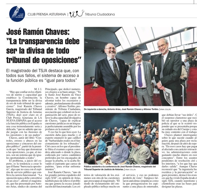 El viernes pasado tuve ocasión de presentar para Tribuna Ciudadana de Oviedo al magistrado José Ramón Chaves, en el centro de la foto junto a Alfonso Toribio, presidente de la asociación organizadora. Impartía una conferencia con el sugerente título de “Controles, errores y abusos en las oposiciones y concursos del empleo público” coincidente con el subtítulo de su último libro “Vademécum de oposiciones y concursos” en editorial Amarante.