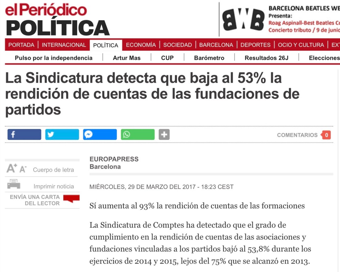 Esta semana, el titular de prensa de El periódico anunciaba las conclusiones del reciente el informe de la Sindicatura de Cuentas de Cataluña relativo a la rendición de cuentas de los partidos políticos y de las asociaciones y fundaciones vinculadas, ejercicios 2014 y 2015. Los auditores efectuaron una comprobación formal de las cuentas rendidas para verificar si se habían presentado dentro de plazo y si la formaciones sometidas al Protectorado de la Generalidad habían enviado toda la información establecida en la normativa vigente. ¿Cuáles son sus principales conclusiones?