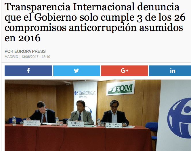El martes pasado, 13 de Junio, Transparencia Internacional España tuvo un interesante acto a cargo de Jesús Lizcano (Presidente), José María Gimeno y Jesús Sánchez-Lambás. Ante los periodistas se presentaron tres interesantes y oportunos informes que han tenido muy poco eco en los medios ante la rabiosa actualidad política de estos días que los ha eclipsado injustamente, porque se trata de trabajos muy costosos y documentados.