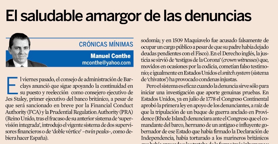 Leo en diario Expansión la perspicaz tribuna de Manuel Conthe titulada “El saludable amargor de las denuncias” donde analiza el papel de la protección del denunciante (whistleblower) a través de un caso concreto acontecido en Barclays. La historia concluye con la amonestación pública del Consejero Delegado del Banco que sufrirá un «ajuste significativo» en su retribución variable, a la espera de conocer las consecuencias por la investigación de los supervisores financieros británicos.