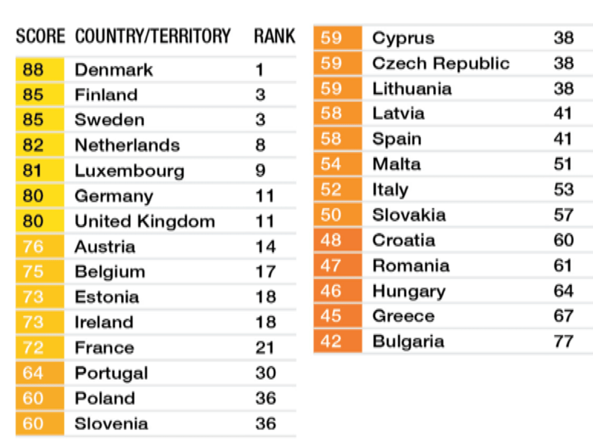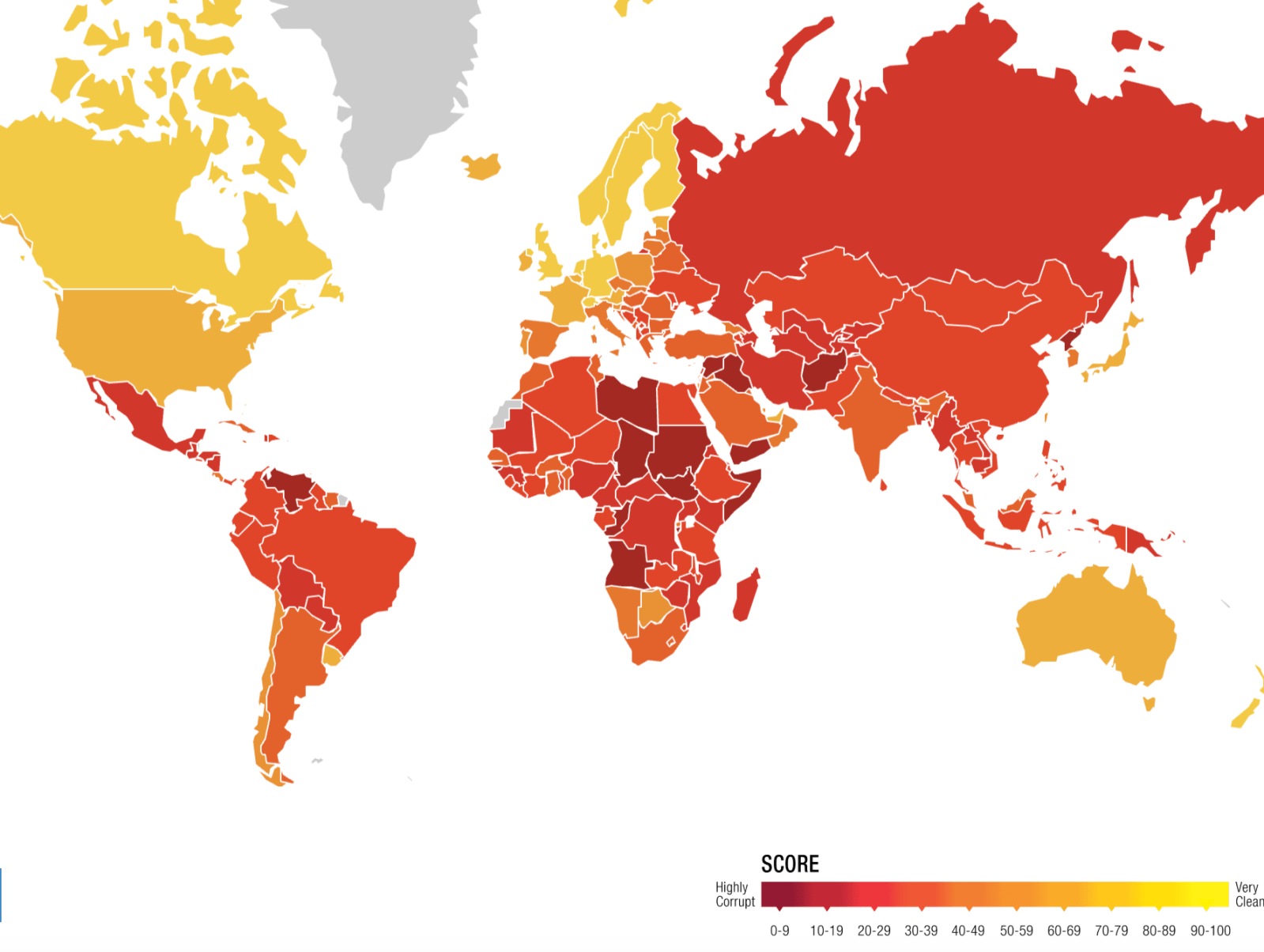 El índice clasifica los países (ver mapa interactivo) según los niveles percibidos de corrupción en el sector público según expertos y empresarios, utiliza una escala de 0 a 100, donde 0 es altamente corrupto y 100 es muy limpio. Más de dos tercios de los países suspenden este año, es decir obtienen puntuaciones por debajo de 50. Sigue dando miedo ver a Rusia con 28 puntos, lo que nos indica claramente la enquistada posición de las mafias alrededor de la Administración.