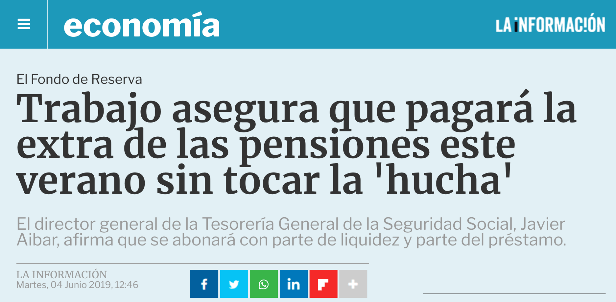 NOTA PERSONAL: Las decisiones de nuestros gobernantes de los últimos años no pueden calificarse como las mejores. Lo peligroso no es que nadie quiera abordar el problema. Lo terrible es que no parece que haya un problema.  Dopar los presupuestos de inversiones con deuda en los ciclos bajos fue un ejercicio   inteligente del Keynesianismo. Emplearla para pagar las pensiones es una irresponsabilidad, cuyas consecuencias sufriremos la próxima década y entonces ya será insoluble el problema, con dos trabajadores por pensionista, en el mejor de los casos. En unos años vendrá la Unión Europea con sus hombres de negro y ocurrirá lo que pasó hace unos años en Grecia … Entonces diremos ¿Cómo pudimos llegar a esto? Realmente me cabrea este asunto. Perdón por el desahogo.