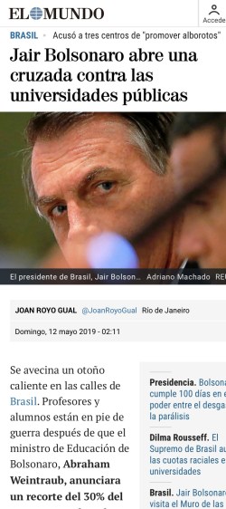 Son muchos los frentes abiertos en la vida cotidiana de las universidades públicas en todo el mundo. En Brasil, su Presidente considera que las universidades son un foco de «marxismo cultural» que debe ser combatido, por lo que el Gobierno ha recortado un 30% del presupuesto. Como veis siempre hay alguna razón para los tijeretazos.