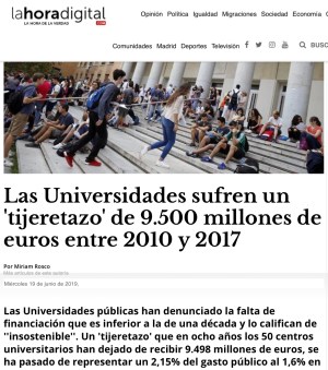 “Los ingresos disponibles en 2016 seguían un 8% por debajo de los de 2008. Los recursos de origen público se habían retraído un 12% y los de origen privado han crecido un 4% (…) Se han perdido 11.938 empleos en la universidad pública (-9%), de los cuales 7.552 son profesores. Las plantillas han envejecido 6 años de media en el PDI y 4 años de media en el PAS. La reducción de la inversión en infraestructuras ha sido del 60,8% amenazando la conservación del stock de capital físico de las universidades. La reducción del gasto en investigación se mantiene en 2016, un 43,2% por debajo del de 2010”.
