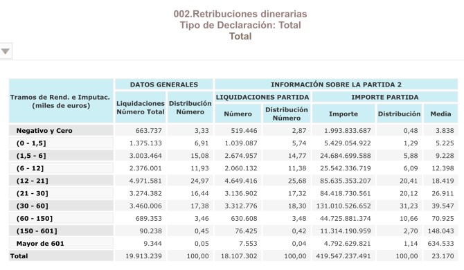 La agencia tributaria reconoce que en el ejercicio 2017 había 100.000 contribuyentes son rendimientos del trabajo superiores a 150.000 euros y doce millones de declaraciones están por debajo de los 21.000 euros: