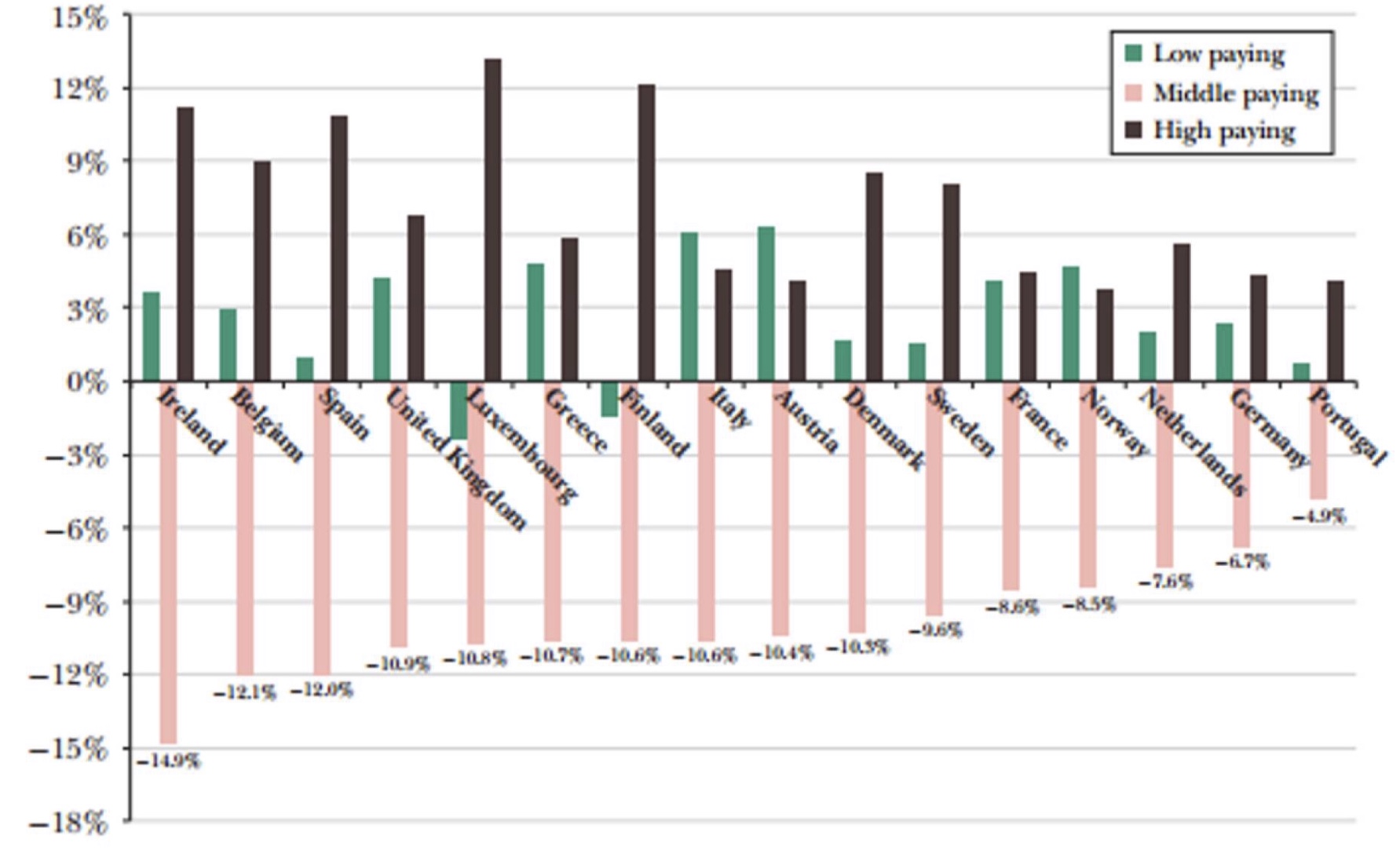 En este escenario, surgen otros riesgos sociales. Algunos economistas, como Daron Acemoglu (MIT) y Pascual Restrepo (Universidad de Yale), concluyen que cada robot nuevo reduce el empleo en 5.6 trabajadores y los salarios en un 0.5%. El avance global de la automatización y digitalización de la economía han contribuido enormemente a la polarización de las retribuciones. Como puede verse en el gráfico siguiente, en lo que va de siglo, en todos los países europeos cae el peso en el empleo de las ocupaciones con un sueldo medio mientras que aumentan las profesiones con altos y bajos salarios.”