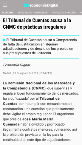 Entre los últimos informes del Tribunal de Cuentas de España que han destacado este aspecto, encontramos la fiscalización de la contratación en los ejercicios 2015 a 2017 de la Comisión Nacional de los Mercados y la Competencia (CNMC). Se trata de una autoridad administrativa independiente (84.1 b) y 109 de LRJSP) cuya misión es garantizar, preservar y promover el correcto funcionamiento, la transparencia y la existencia de una competencia efectiva en todos los mercados y sectores productivos. El informe se enfrenta, así pues, a todo un reto: conocer si los procesos de adquisición de suministros y servicios o de licitación de obras de quien debe protegerlos están a la altura de tan nobles objetivos. No faltará quien piense que el Tribunal de Cuentas marcaba el territorio.