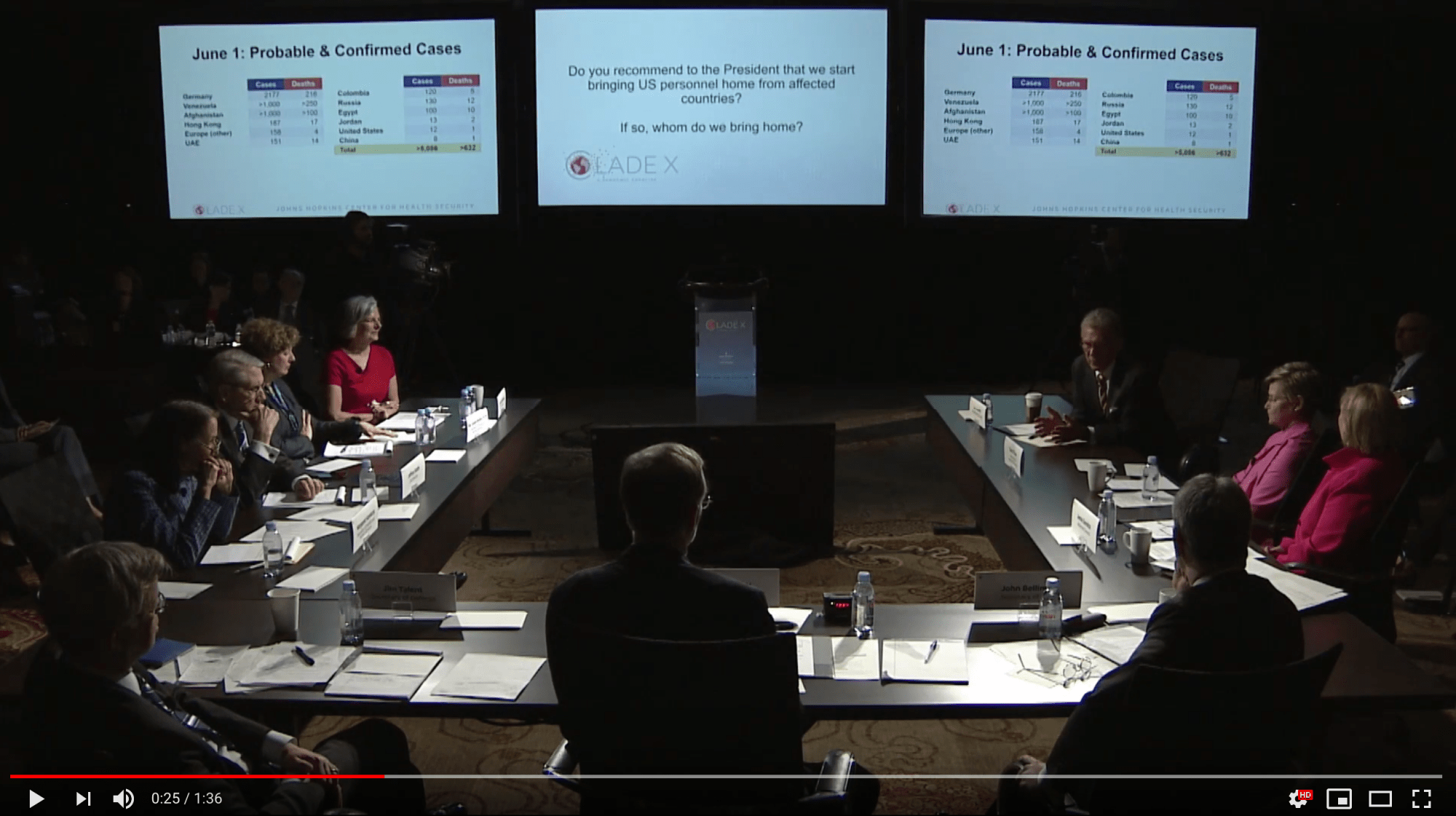 Para dar respuesta a estas y otras interesantes preguntas se había realizado un ejercicio simulado de un día (ojo, ¡en mayo 2018!) sobre cómo reaccionarían los miembros del Consejo de Seguridad Nacional de EEUU en respuesta a una pandemia creciente. Lo llamaron Clade X y fue transmitido en vivo por Internet (canal de youtube).