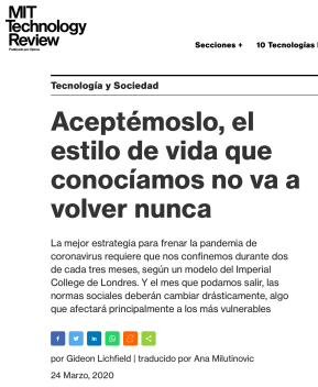 Como en el llamado modelo Kübler-Ross, las etapas frente a cualquier tragedia (comúnmente una enfermedad terminal) fui atravesando las cinco fases: negación, ira, negociación, depresión y aceptación. Como titula la prestigiosa MIT Technology Review, “Aceptémoslo, el estilo de vida que conocíamos no va a volver nunca”. El editor en jefe de esa revista Gideon Lichfield, nos avisa: en los próximos meses, puede que años, viviremos en una economía de pandemia donde algunas actividades de masas deberán adaptarse. El transporte de viajeros o futbol, por supuesto, pero también la educación así como tantos y tantos congresos presenciales que han constituido durante años un foro de crecimiento personal y profesional. La noble tradición hispana de ir de cañas o de sidras … ¿sobrevivirá?.