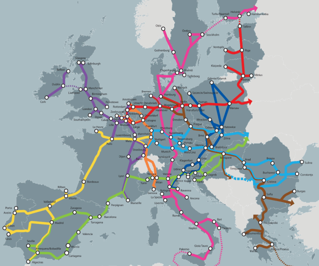 La mayor parte del trafico europeo de pasajeros y mercancías circula por carreteras. La Comisión busca completar en 2030 casi 50 000 km de autopistas y vías rápidas en los nueve corredores de la red básica de la RTE-T y en todas las rutas principales de trafico de la UE.