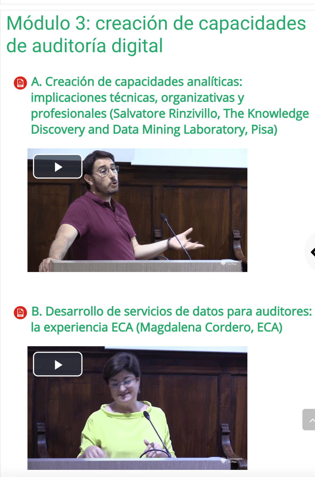 Esta plataforma de aprendizaje en línea es de acceso libre para el público general a través de la siguiente dirección https://ecademy.eca.europa.eu . Entre el valioso material todo en inglés (si te manejas mal, recuerda que Chrome traduce automáticamente) profundiza en cursos como auditoria de performance, auditoria digital, big data, etc. Las conferencias son también en inglés (ahí Chrome no podrá ayudarte).