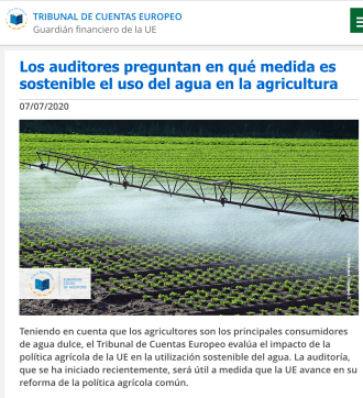 Otra característica peculiar del Tribunal de Cuentas Europeo es que no esperan a terminar los trabajos si encuentran algún mensaje objetivo digno de trasladar a la opinión pública. A veces divulga una interesante cuestión que va a intentar responder en un futuro informe. La pregunta tiene un importante efecto pedagógico sobre la sociedad civil, tan importante como la misma respuesta. Por ejemplo, esta misma semana publicaba un recordatorio del interesante trabajo que está desarrollando para evaluar el impacto de la Política Agrícola Común en la utilización sostenible de los recursos. Alertaba de que la cuarta parte del agua dulce extraída en la UE se utiliza en la actividad agrícola, afectando no sólo a la cantidad y disponibilidad de todos los recursos hídricos, sino también a su calidad a través de la contaminación producida por fertilizantes y plaguicidas. Por ello, avanza: «Nuestra auditoría tiene por objeto determinar en particular si la acción de la UE y sus Estados miembros en la agricultura aplica e impone de forma adecuada y eficaz los principios de gestión sostenible de este recurso vital».
