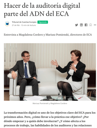 El cuidado Journal del Tribunal de Cuentas Europeo dedicó a principios de este año un interesante ejemplar monográfico (1/2020) a estas reflexiones con los mejores conocedores del entorno digital. Uno de ellos es Felipe Castro Barrigón impulsor del Grupo de Trabajo «Innovación y auditoría digital» del Servicio de auditoria interna de la Comisión Europea, que está a la vanguardia de la exploración de nuevos desarrollos para traducirlos en prácticas laborales diarias. En este artículo comparte algunas de las características clave del enfoque para los próximos años. Tendremos ocasión de conocerle en el congreso de FIASEP, junto a Magdalena Cordero Valdavida, ponente habitual en España desde su alto puesto directivo del Tribunal de Cuentas Europeo, donde lleva bastante tiempo trabajando en digitalización y auditoría. En esta entrevista presenta interesantes reflexiones de esa experiencia.