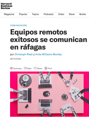 Esta misma semana, una investigación de HBR demostraba algo obvio: : cuanto menor sea el número de ideas incluidas en un correo electrónico a los colaboradores, más fácil será profundizar y obtener algún retorno sobre cada asunto. A los jefes rollistas simplemente nadie les contesta. Así que, en lugar de enviar un mensaje largo con tres temas, por ejemplo, proponen enviar tres separados. La nueva estrella en la economía de la atención es la comunicación “a ráfagas”. Menos esperado fue descubrir la preferencia por las reuniones de solo audio frente al vídeo. Esta disminuye la igualdad en el tiempo de uso de la palabra y por tanto la inteligencia colectiva.