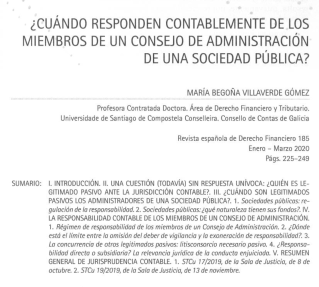 Para terminar destacamos un reciente artículo de María Begoña Villaverde Gómez titulado ¿Cuándo responden contablemente los miembros de un consejo de administración de una sociedad pública? (Revista española de derecho financiero, Nº 185, 2020, págs. 225-249) que, en su doble condición de académica (profesora de la Universidad de Santiago) y miembro del Consello de Contas de Galicia, investiga en las últimas sentencias del Tribunal de Cuentas de España para determinar la extensión subjetiva de la responsabilidad contable.