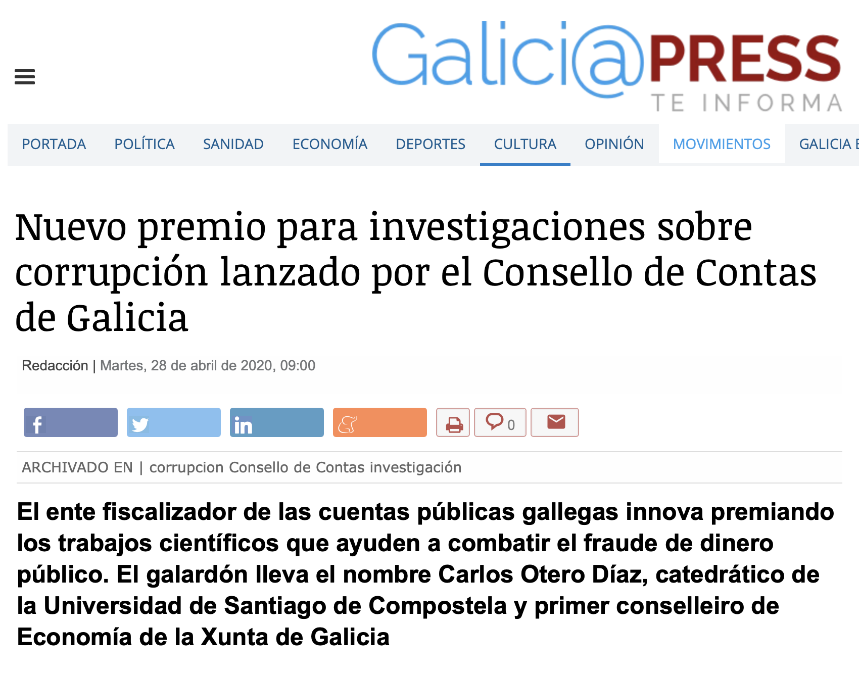 Por eso, hay que felicitar al Consello de Contas al crear el Premio de Investigación que lleva su nombre en el marco de las nuevas funciones de prevención de la corrupción del OCEX gallego. Este mes ha hecho público el fallo de su primera edición, a propuesta de una comisión de la que tuve el honor de formar parte y que valoró los trabajos de forma anónima.