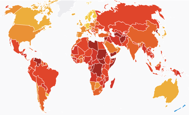 Con 88 puntos cada una, Dinamarca y Nueva Zelanda se sitúan a la cabeza del índice. En el extremo opuesto se encuentran Siria, Somalia y Sudán del Sur. Cerca de la mitad de los países llevan casi una década estancados en la misma posición.