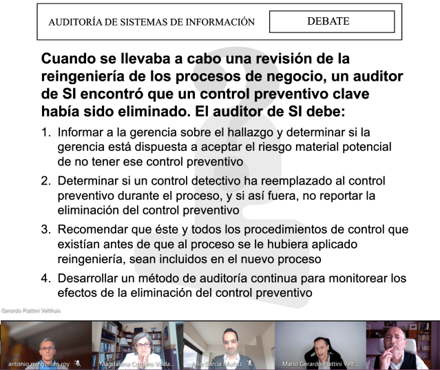 Debatimos también diferentes formas de gobierno de TI (centralizado, federal, descentralizado), los temas relacionados con la rendición de cuentas (accountability) y responsabilidades (responsability) sobre las TI en la organización; así como el papel del auditor interno en su gobierno y gestión.