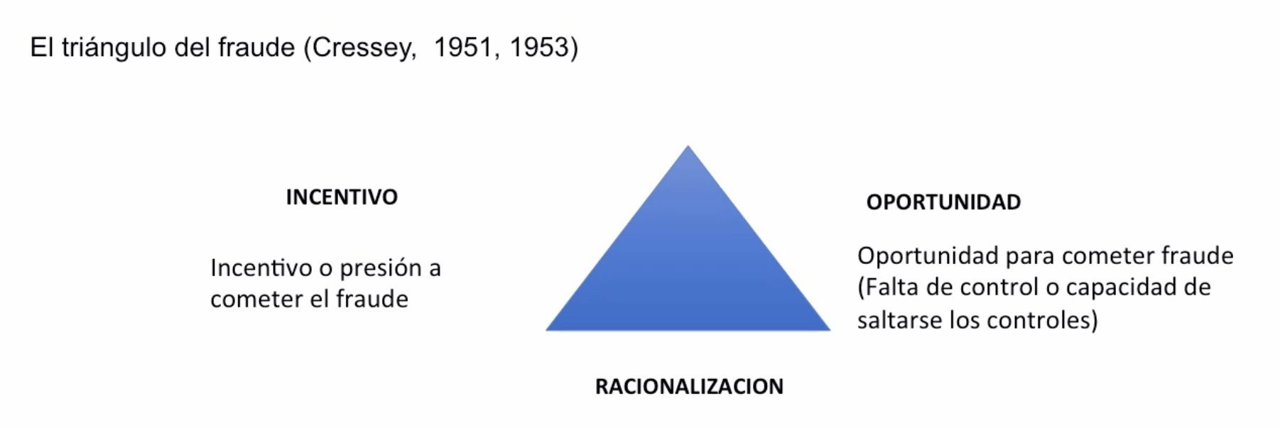 El triángulo del fraude cumple setenta años. Desde que fuera formulado por primer vez por el criminologo norteamericano Donald R. Cressey en 1951, se ha convertido en un clásico que se utiliza tanto en la investigación sobre la delincuencia organizada como en auditoría interna. Los tres lados son: la motivación (incentivo propio o externo), la oportunidad (deficiencias del control interno) y la racionalización (la actitud para justificar sus actos).