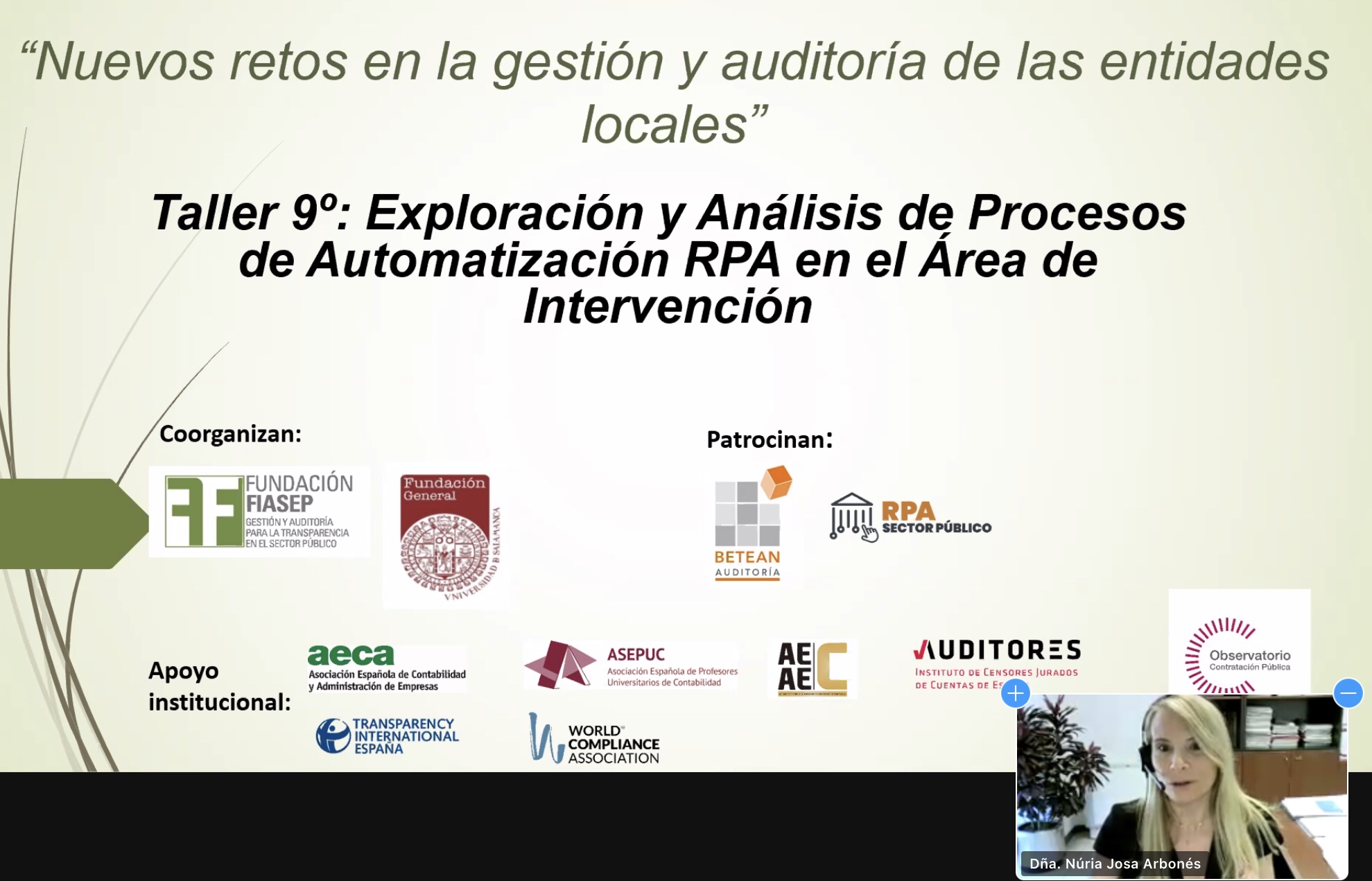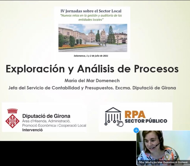 La Diputación de Girona estaba representada por Núria Josa (Interventora General) y María de Mar Doménech (Jefa del Servicio de Contabilidad y Presupuestos) que compartieron mesa virtual con Txema Arnedo Director de Análisis de Procesos de RPA Sector Público presentando su experiencia y el aprendizaje obtenido con la RPA (Proceso de Automatización Robótica) realizado con éxito entre octubre 2020 y enero 2021. Una nueva tecnología informática por la que un software puede realizar tareas e integrar acciones que normalmente realiza un ser humano utilizando sistemas informáticos.