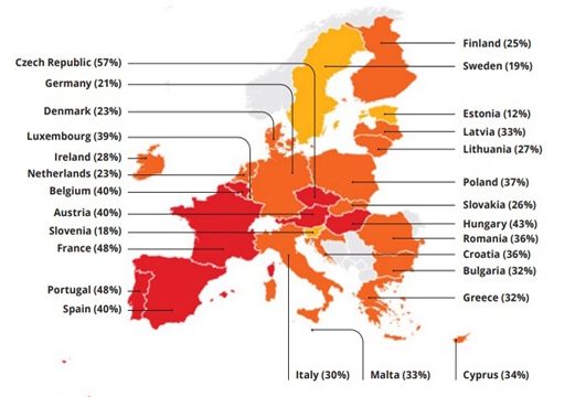 Mapa: Porcentaje de usuarios de servicios públicos que utilizaron conexiones personales para obtener un servicio en los últimos 12 meses. España 40%, Francia, 49%. Como en la Liga de las Naciones en fútbol, Francia nos supera. Eso sí: nosotros ganamos a Italia.