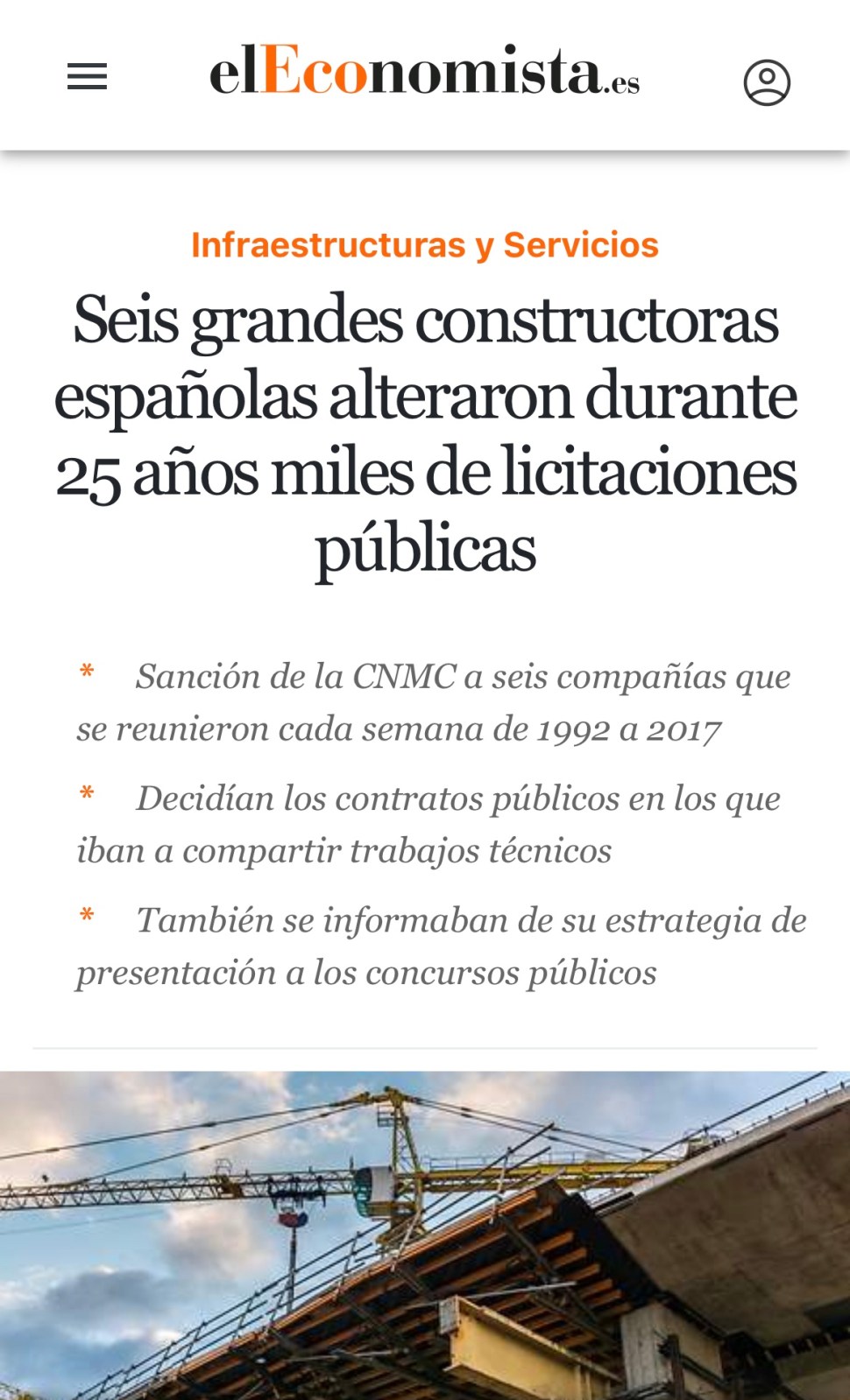 Esos mismos días conocíamos por la prensa la sanción de la CNMC a las seis principales empresas constructoras de España, tras un proceso que ha durado ocho años. En total una multa de 203 millones de euros. Las contratistas se reunieron semanalmente y de forma rotatoria en cada sede para analizar las oportunidades de las licitaciones convocadas y compartir el elevado coste de los informes preceptivos para concurrir. Su principal argumento era obtener ahorros en trabajos comunes como los estudios ambientales, geotécnicos o informes de seguridad, salud e higiene, comprobación de mediciones, estudios de detalle, topografía, geotecnia, servicios afectados por las obras, y revisiones técnicas que servían de base para la elaboración de las ofertas técnicas. La CNMV entiende que esto ocurrió en 3.200 concursos entre 2009 y 2016 por 46.000 millones de euros.