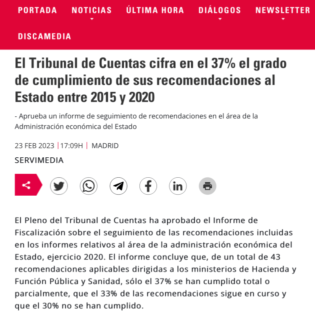 El Tribunal de Cuentas acaba de aprobar un informe de seguimiento de recomendaciones en el área de la Administración económica del Estado, donde concluye que, de un total de 43 recomendaciones aplicables dirigidas a los ministerios de Hacienda y Función Pública y Sanidad, sólo el 37% se han cumplido total o parcialmente, que el 33% de las recomendaciones sigue en curso y que el 30% no se han cumplido.