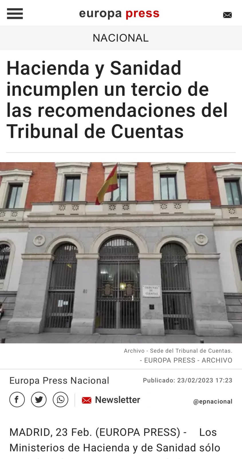 El Tribunal de Cuentas acaba de aprobar un informe de seguimiento de recomendaciones en el área de la Administración económica del Estado, donde concluye que, de un total de 43 recomendaciones aplicables dirigidas a los ministerios de Hacienda y Función Pública y Sanidad, sólo el 37% se han cumplido total o parcialmente, que el 33% de las recomendaciones sigue en curso y que el 30% no se han cumplido.