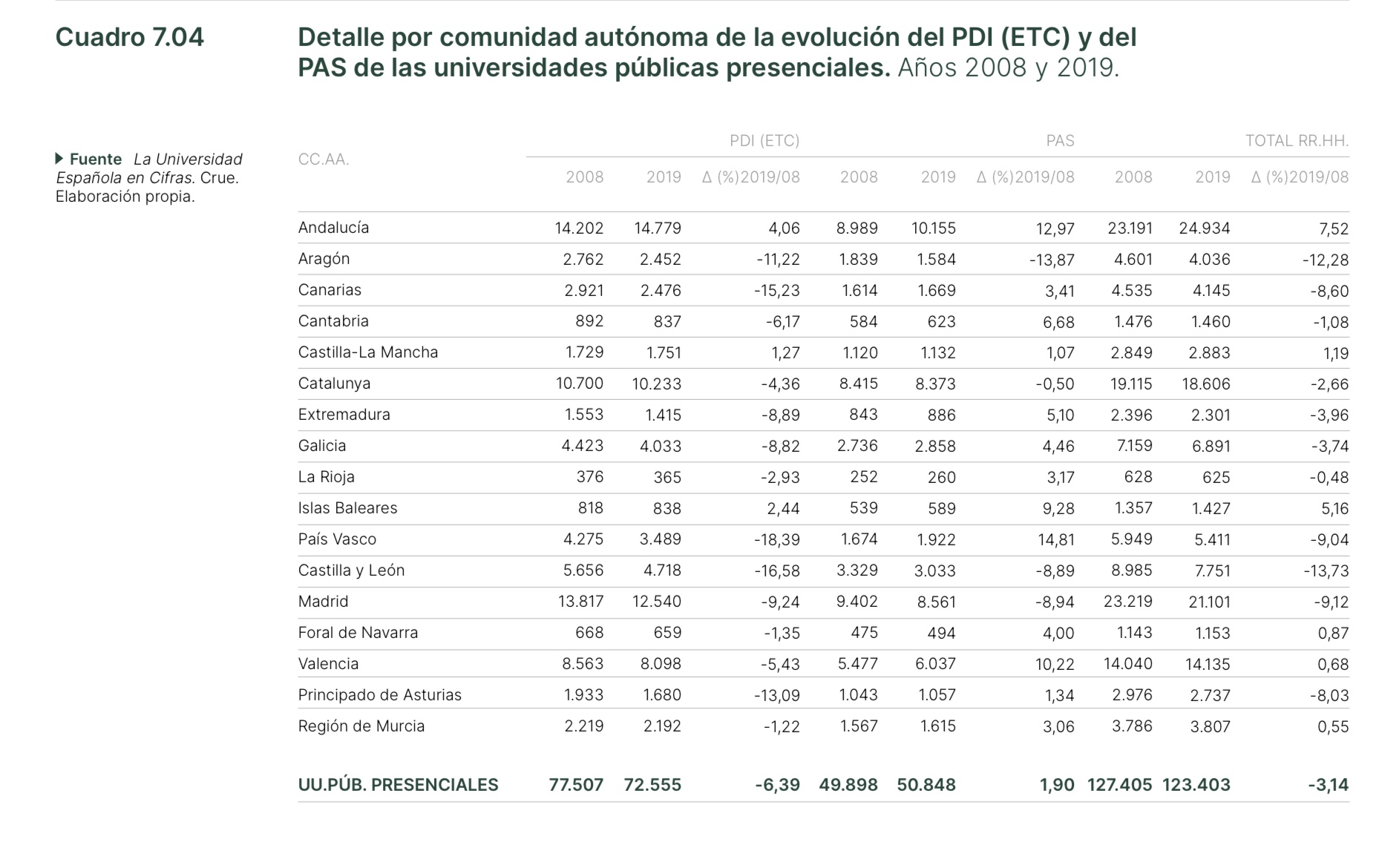 Tras el cierre de esta nueva oleada de datos relativa al año 2019 y el curso 2019-2020, la conclusión de los responsables de esta nueva edición sigue siendo que, desde que se hizo presente la anterior crisis económica en 2009, el SUE ha mantenido una secuencia consistente de mejora continua de sus resultados docentes y de I+D+i, y lo ha llevado a cabo en condiciones muy difíciles: con una acusada reducción de la financiación pública y privada, la consiguiente descapitalización y precarización de su capital humano y su paulatino envejecimiento; con una híper regulación de la gestión de sus recursos humanos, de la gestión de la investigación, y de sus condiciones orga- nizativas, que han reducido –todavía más- su ya escasa autonomía de funcionamiento, lo que ha debilitado su potencial institucional para obtener resultados.