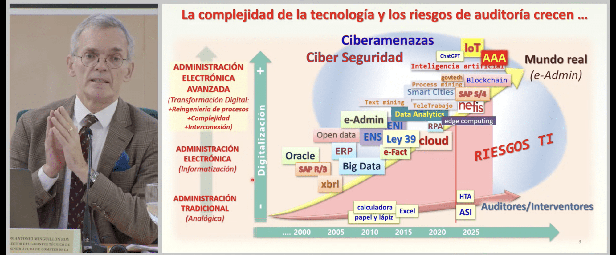 Continuó nuestro también conocido Antonio Minguillón Roy, Director del Gabinete Técnico de la Sindicatura de Comptes de la Comunitat Valenciana, que expuso su visión sobre “La gobernanza de la ciberseguridad: por qué es tan importante y por qué no se le da la importancia debida”. Empezó su exposición destacando algunas cuestiones previamente expuestas y con las que coincidía, en primer lugar la importancia de considerar proactivamente los riesgos de ciberseguridad en aquellas entidades que estaban experimentando un proceso de transformación digital, proceso que caracterizó por tres cuestiones fundamentales: (a) la necesaria reingeniería de procesos para adaptarlos y optimizarlos a (b) la utilización de tecnologías muy complejas con (c) sistemas hiperconectados.