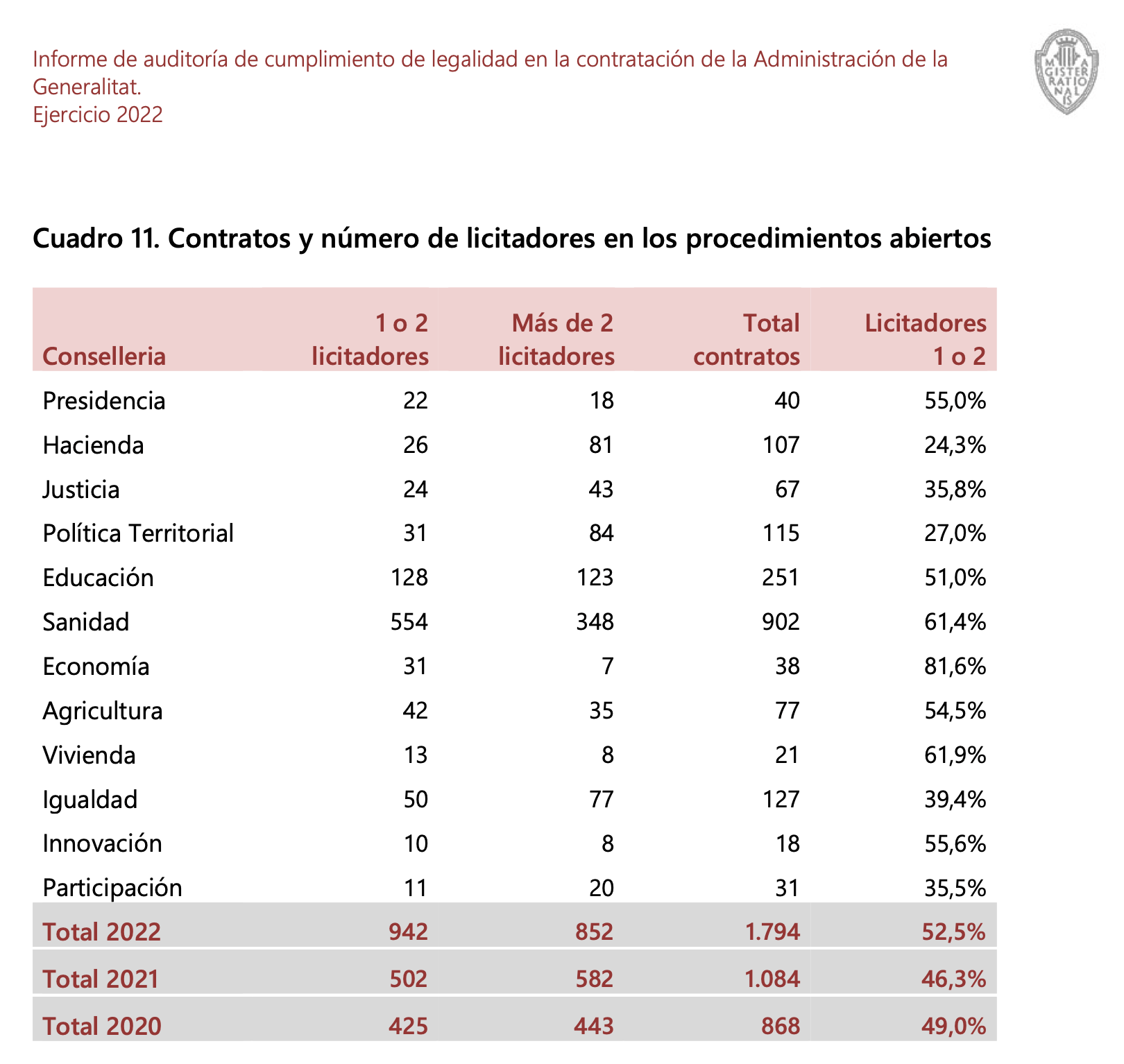 De hecho la Sindicatura de Cuentas de la Comunidad Valenciana, en su reciente informe de auditoría de cumplimiento de legalidad en la contratación de la Administración de la Generalitat relativa al ejercicio 2022 destaca (epígrafe 5.1.1) en el análisis de la actividad contractual, al igual que en ejercicios anteriores, una escasa concurrencia en las licitaciones por procedimiento abierto, tal como mostramos en el siguiente cuadro: