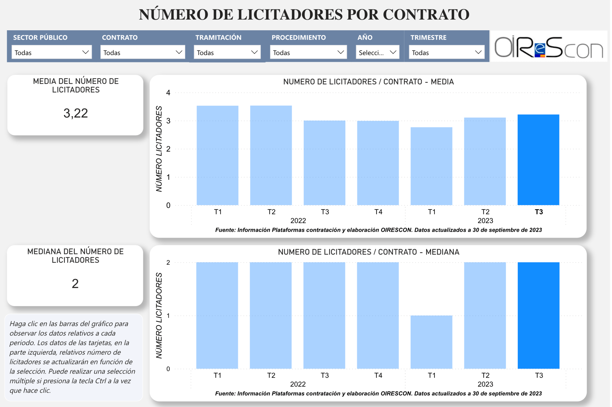 En los datos abiertos registrados en Plataformas de contratación a 30 de septiembre de 2023 encontramos (pág 8). Tres licitadores de media: