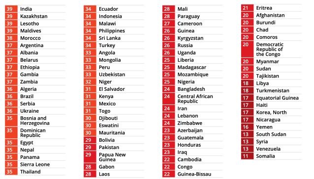 Dinamarca encabeza el índice por sexto año consecutivo (90 puntos), con Finlandia y Nueva Zelanda seguidas de cerca (87 y 85). Los Estados meridionales europeos, como siempre aparecemos en peor posición. Si se observa la clasificación, se destacan las habituales naciones ejemplares, aunque no todas están para tirar cohetes. Varias democracias de primera, incluyendo Suecia (82%), Países Bajos (79%) y el Reino Unido (71%), han registrado las puntuaciones más bajas de su historia.