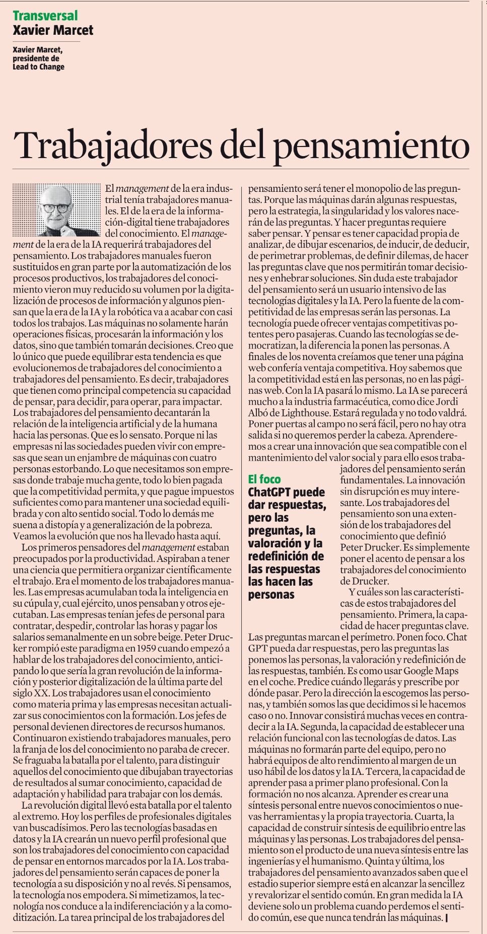 Así, pude disfrutar de una interesante reunión como os digo, con brillantes profesionales del mundo del control interno. Siete en total, un número ideal que permite intercambio de opiniones, preocupaciones, intereses o risas. En un momento determinado, salió (¡como no!) el uso de la inteligencia artificial generativa como herramienta cotidiana del funcionario público. Yolanda Guimera, viceinterventora en la Diputación de Tarragona, es usuaria de la última versión profesional de Chat GPT. Aprovechamos para preguntarle por el perfil del Interventor Local de la próxima década. Su respuesta resumida giró alrededor de dos conceptos: será un estratega, así como un analista de datos. Usará herramientas de análisis e inteligencia lo que exigirá conocer técnicas de consulta de base de datos. No es extraño que Yolanda lo use de manera cotidiana para moverse con los propios archivos internos. Me consta que muchos otros interventores lo hacen también, como trabajadores del pensamiento, estadio más evolucionado del trabajador del conocimiento, como nos recordaba Xavier Marcet en el suplemento dominical de La Vanguardia.