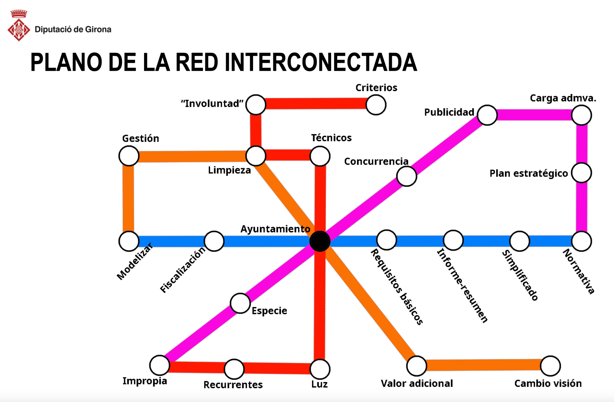 Linea de metro para el control interno: azul económica, violeta subvenciones, rojo contratación, naranja recursos humanos.