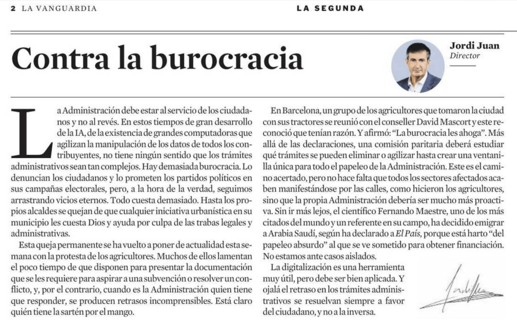 Interesante Editorial del 10 de febrero pasado en La VanguardiaYa todo es electrónico, lo que permite procedimientos ágiles y transparentes, aunque ha producido, en expresión acuñada por el magistrado José Ramón Chaves, la sustitución de la burocracia por la “electrocracia”. Un problema no solo afecta al ciudadano que se relaciona con la Administración sino a los propios empleados públicos o a los particulares cuando actúan como agentes públicos suministrando información a la Administración. Son los clientes internos, a quienes el aplanamiento de las organizaciones carga de tareas digitales a pesar de ser los empleados más cualificados.
