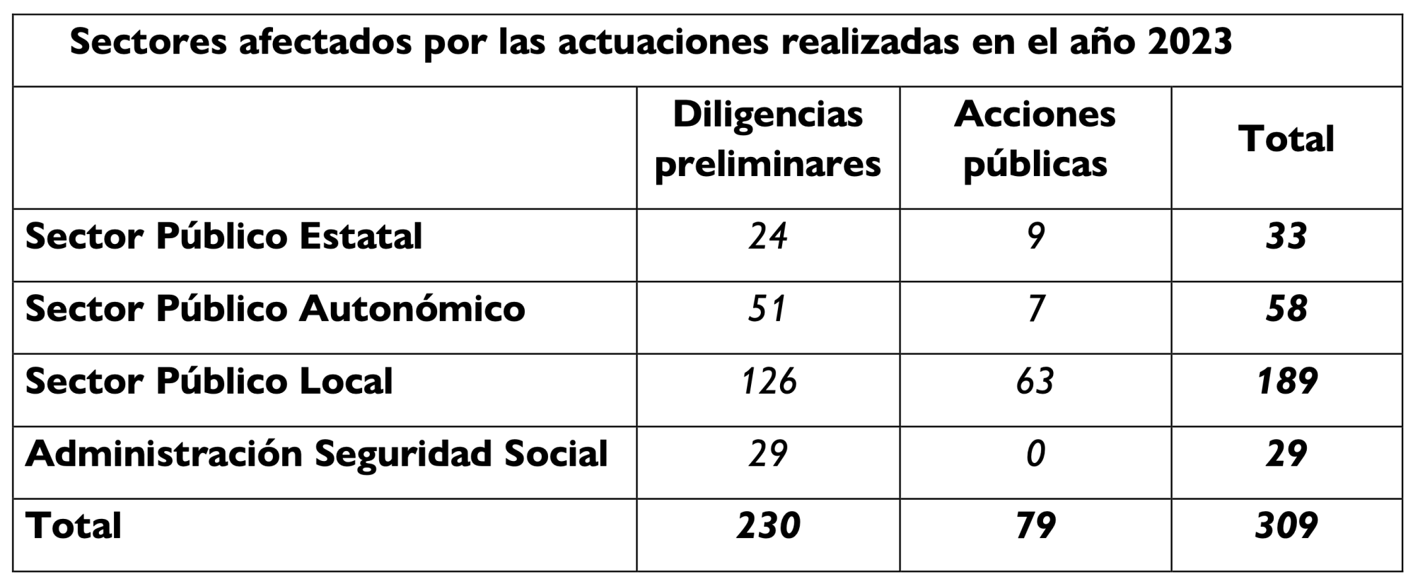 El Tribunal de Cuentas, en su memoria del año 2023 (pág. 56) reconoce que durante ese ejercicio se abrieron para enjuiciamiento de la responsabilidad contable, un total de 309 actuaciones, de las cuales 230 son Diligencias Preliminares y 79 acciones públicas ante la existencia de presuntos indicios de responsabilidad según puede verse en el cuadro superior. de ellas, 189 corresponden a Corporaciones Locales.