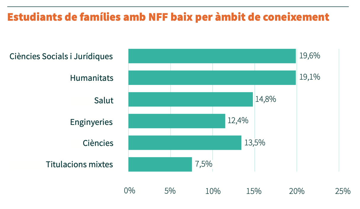 Por áreas de conocimiento, los estudiantes que provienen de un entorno familiar con nivel formativo bajo (NFF) están más representados en las ramas académicas de Ciencias Sociales y Jurídicas (19,6%), Humanidades (19,1%) y Salud (14,8%), que no paso en Ciencias (13,5 %), Ingenierías (12,4 %) y Titulaciones Mixtas (7,5 %).