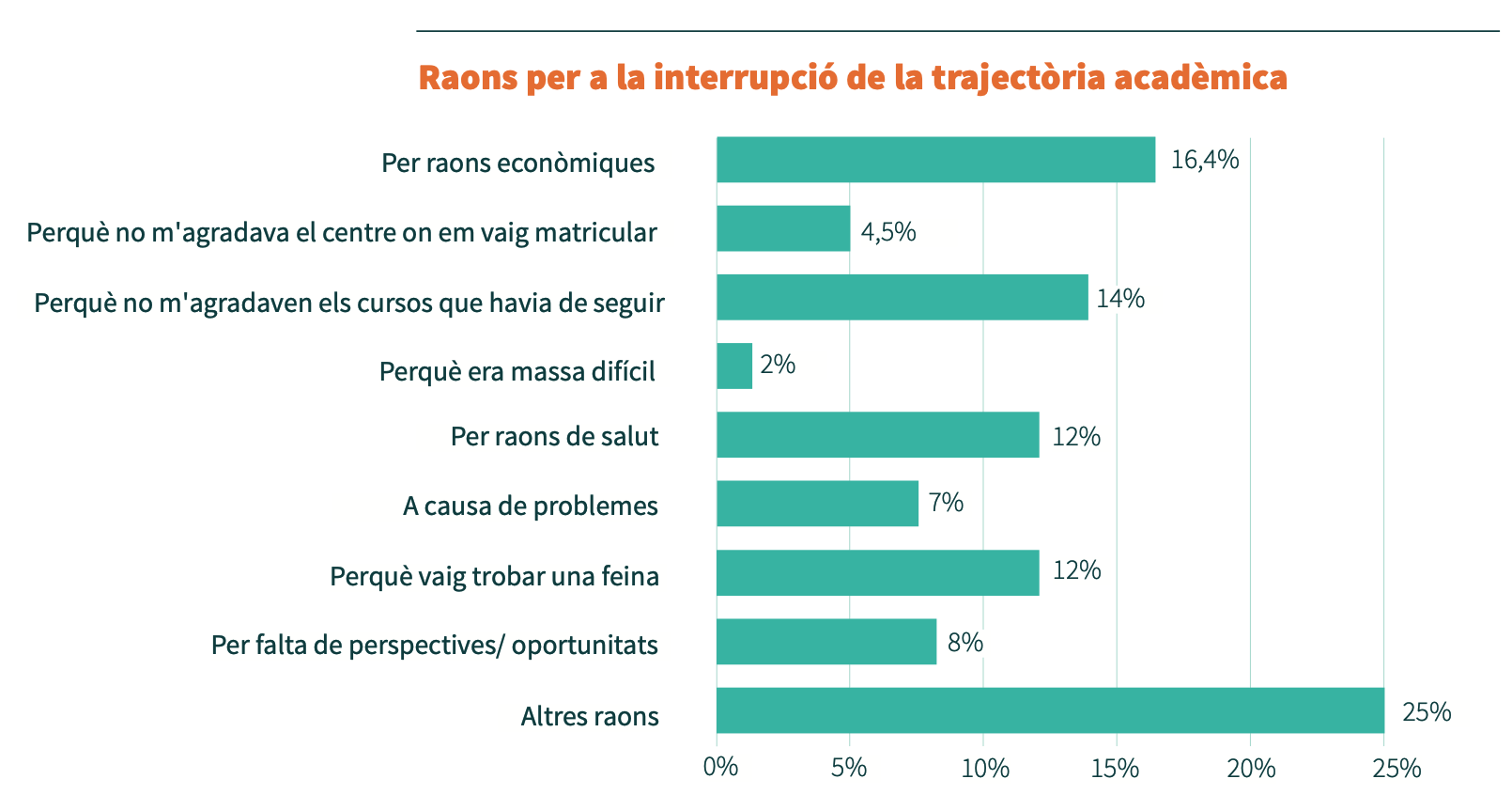Precisamente, a través de Via Universitària conocemos datos de encuestas sobre la otra cara de la moneda a través de un programa que pretende generar información amplia sobre las condiciones de vida y las formas de vinculación con el estudio de la población estudiantil universitaria de Cataluña, de la Comunidad Valenciana y de Islas Baleares. A través de la última encuesta sabemos que la interrupción de las trayectorias de los estudiantes apuntan a las dificultades económicas como las razones más frecuentes, conjuntamente con desagrado de los estudios, problemas de salud o la incorporación en el mercado de trabajo.